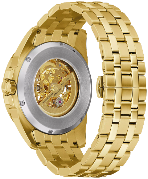 WATCH BULOVA MENS ROUND GOLD TONE ST STEEL ROMAN MARKERS SKELETON DIAL