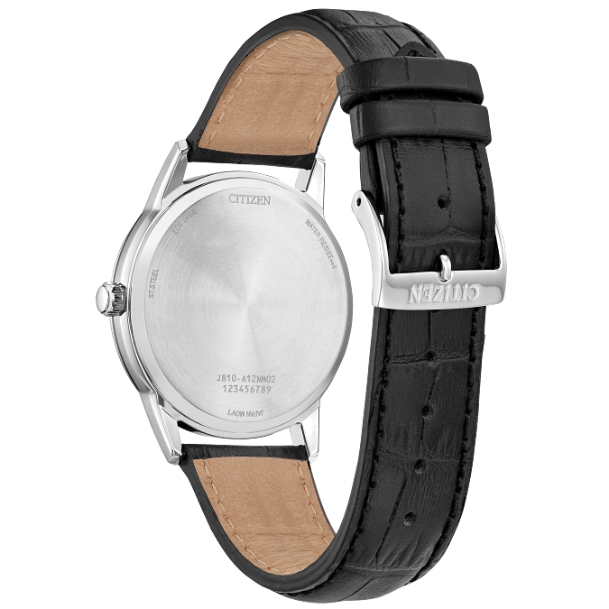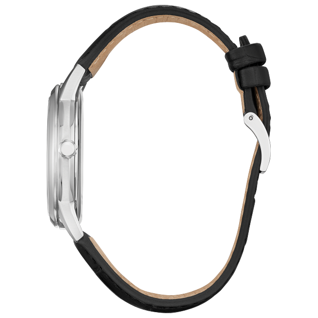 Classic lines and a simple silhouette define the newest addition to the Classic collection. This vintage-inspired timepiece features a silver-tone stainless steel case, a striking blue 3-hand dial with a date function, and a rich black leather strap with buckle closure. Sustainably powered by any light with Eco-Drive technology and never needs a battery.