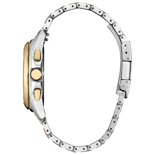 Make a distinctive style statement that's ready for action with this new Sport Luxury chronograph. The 40.5mm two-tone silver- and gold-tone stainless steel case holds a sunray green dial with a 1/5 second chronograph that measures up to 60 minutes, 12/24-hour, time, and date. The sleek dial is accented with gold-tone registers and indices, with it protected via a sapphire crystal. The two-tone stainless steel bracelet has a fold over clasp with push buttons, giving the timepiece a secure, understated refinement. This Eco-Drive watch is sustainably powered by any light source, eliminating the need for batteries, and is water resistant up to 100 metres. Caliber B620.