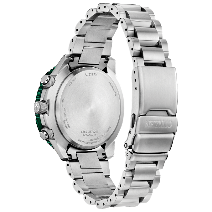 Take to the skies with the innovative Promaster Air men’s watch from Citizen. This exceptional pilot’s watch features a black stainless-steel case accented by a blue dial incorporating advanced technology such as atomic time clock synchronization for superior accuracy, 1 second chronograph measures up to 60 minutes, and a perpetual calendar. The sleek dial is encased in a genuine sapphire crystal. The silver-tone stainless steel bracelet fastens with a safety fold over clasp with push buttons. This fine timepiece utilizes Eco-Drive technology—powered by light, any light—meaning it never needs new batteries. Water resistant up to 200 metres, this extraordinary watch will take you from the depths of the ocean to new heights with its precision movement and unparalleled style.