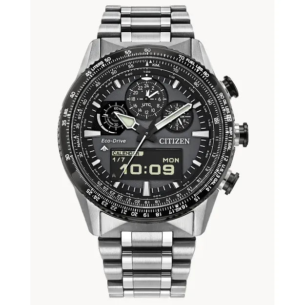 Reach a higher altitude in style and performance with the new Promaster Skyhawk U830. This action-ready chronograph features a black- and silver-tone stainless steel case and a captivating analog-digital dial, with its bold 43mm shape secured to the wrist via a sharply finished triple-link bracelet. A rotating slide-rule bezel alongside a modern set of pushers and a matching crown round out the sporty styling of the case.